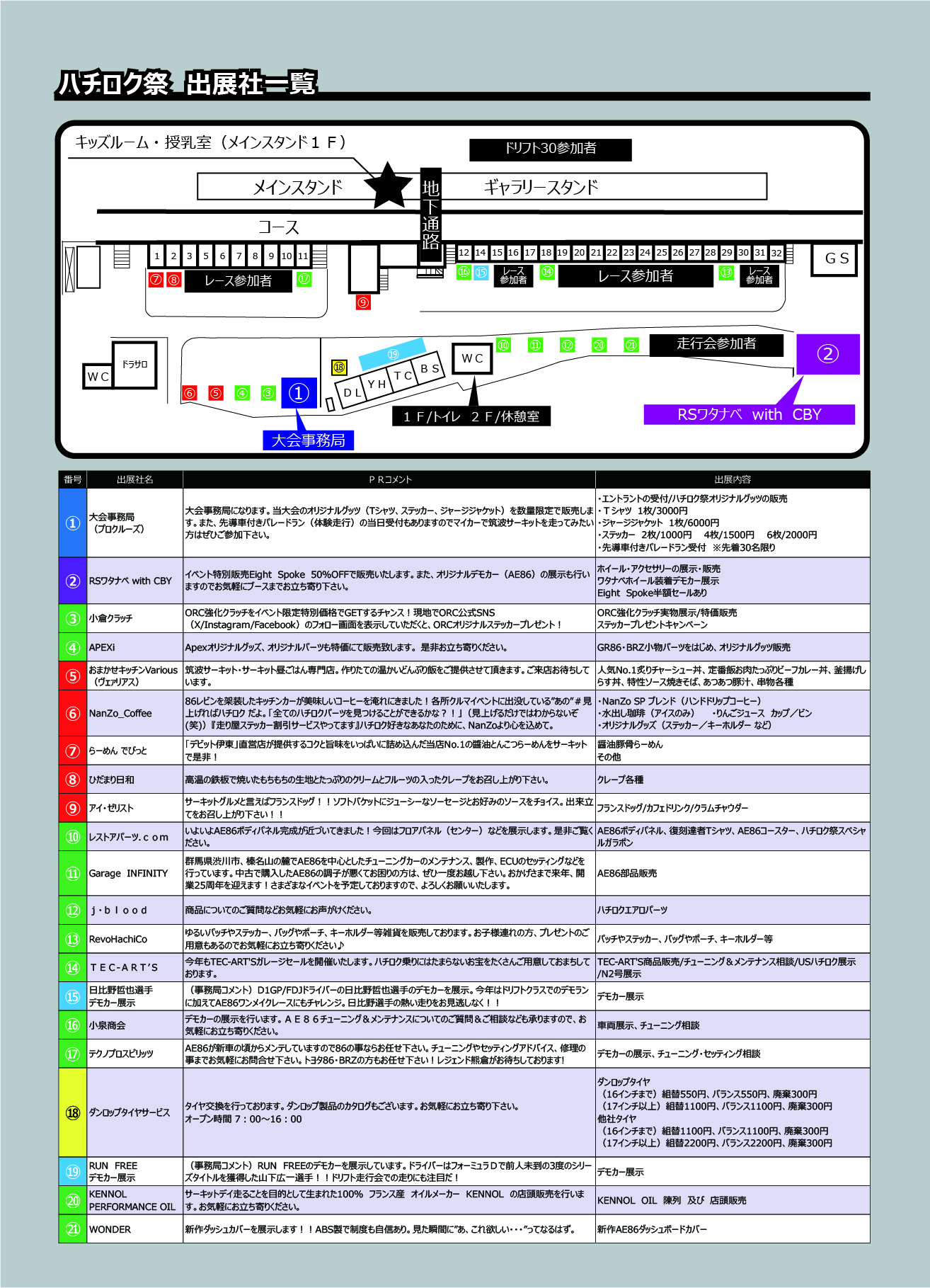 AE86の頂上決戦 AE86ワンメイクレース、トヨタ86ユーザー向けのレース形式の走行会 86/BRZサーキットチャレンジ、AE86&トヨタ86ユーザー限定の グリップ走行会&ドリフト走行会、走りの聖地を体験走行できる 先導車付きパレードラン(車種制限なし)、AE86限定の集って楽しい AE86ミーティング、有名チューナーやメーカーによるブース出展を実施いたします!!