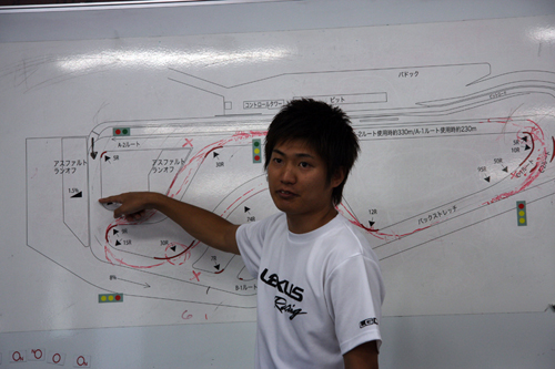 松田選手とチャレンジクラスを担当した。「僕の担当したクラスは、このコースはじめてという人が少なかった。実際、皆さん走り慣れてる感じでした。ここは1,2,3コーナーがポイントですかね。1回目のミーティング後は、皆さん、そこを重点的に走ってもらいました。2回目のミーティングでは1,2コーナーの縁石カットの仕方を伝えました。皆さん、どんどん良いラインになってくるので嬉しかったです。走り慣れた方でも、何かを掴んでいただけたかな、と思います」